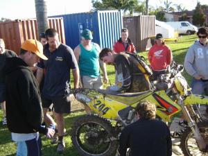 Picture: Merv Heard working on his bike back at parc ferme – all the NZ team waited for Merv to clock in and gave him their full support – a great team to be associated with.