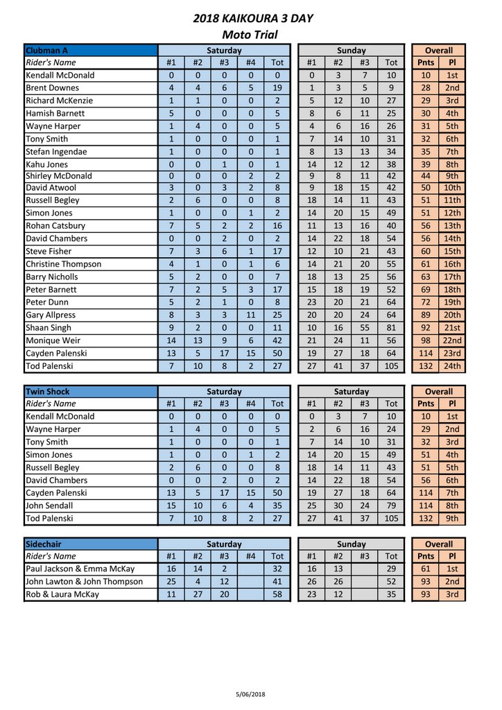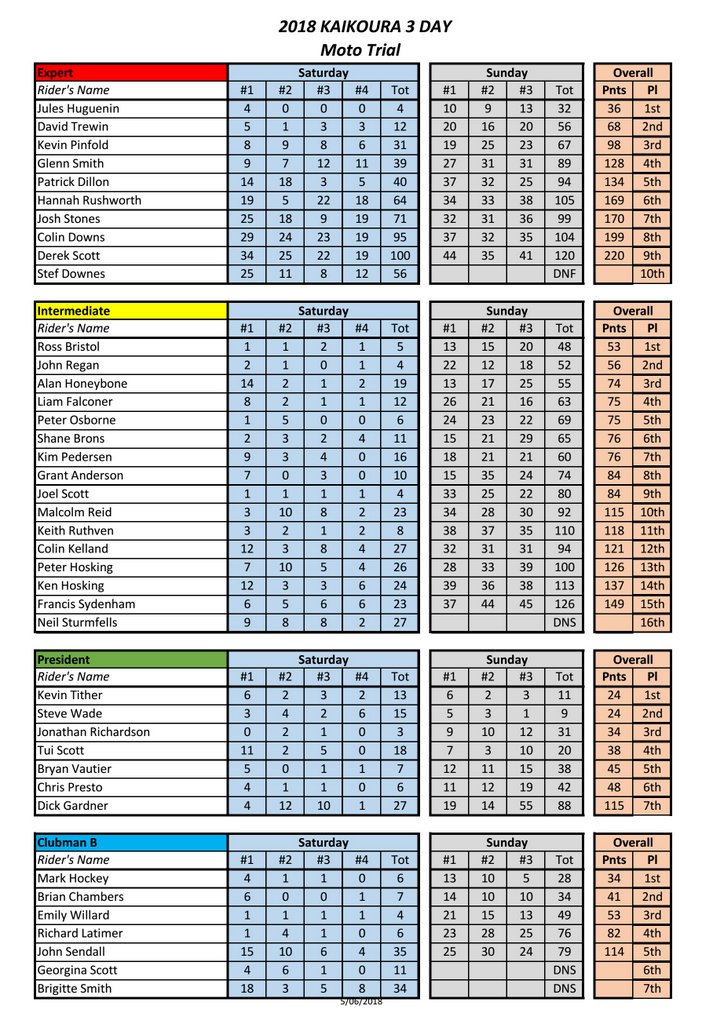Kaikoura 3 Day Trial, RESULTS