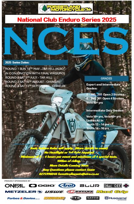 The coming weekend is the second round of the NCES enduro series on the 5th of July to be held again at Tar hill south of Tokoroa.